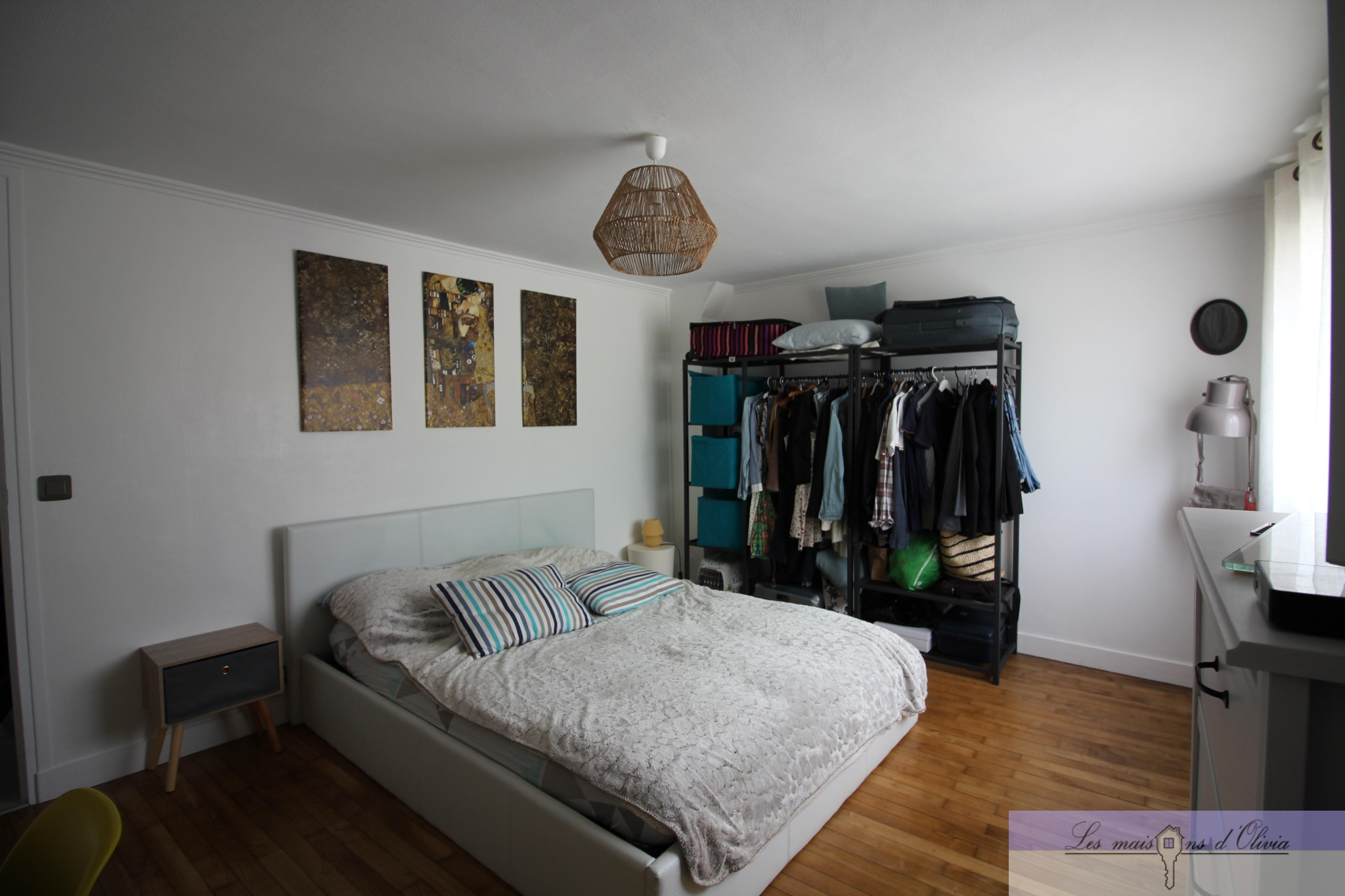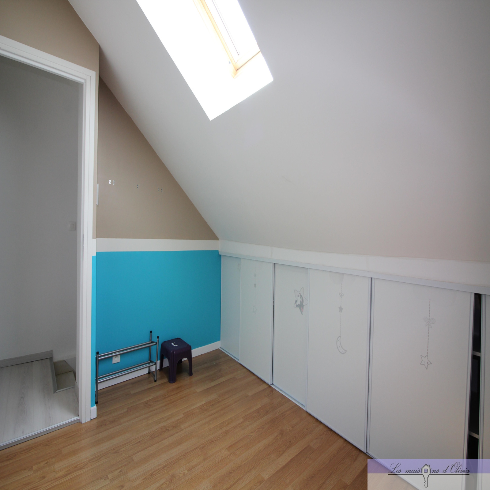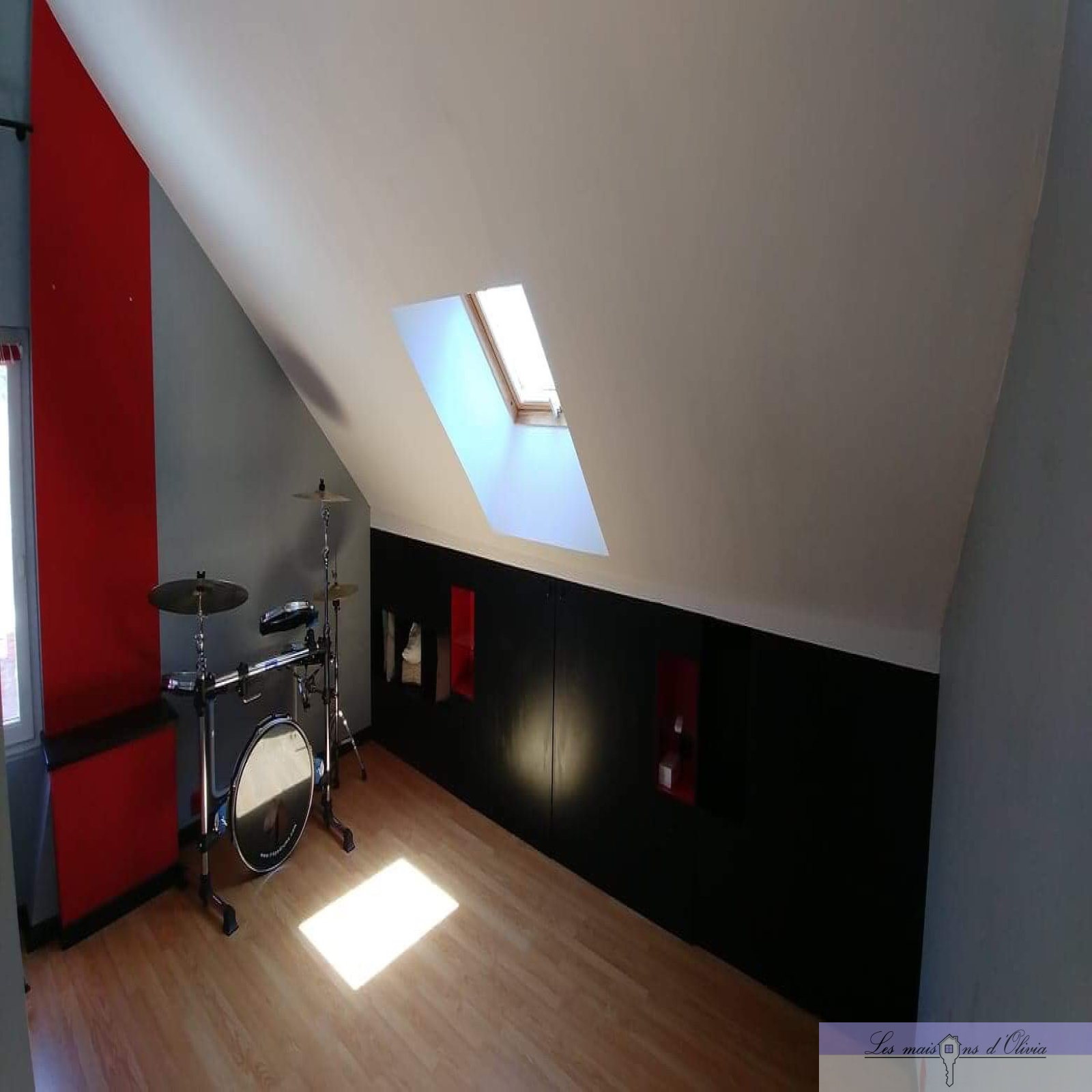 Elle comprend un séjour (env 28m²) avec cuisine ouverte aménagée donnant sur la partie terrasse/jardinet, wc , le 1er étage bénéficie d' une chambre d'environ 15m², une salle de bains qui offre, en plus de la baignoire, une douche à l'italienne et wc, combles aménagés en 1 chambre et 1 bureau avec velux.