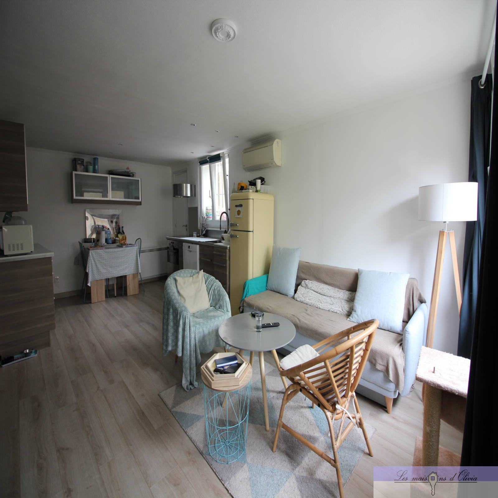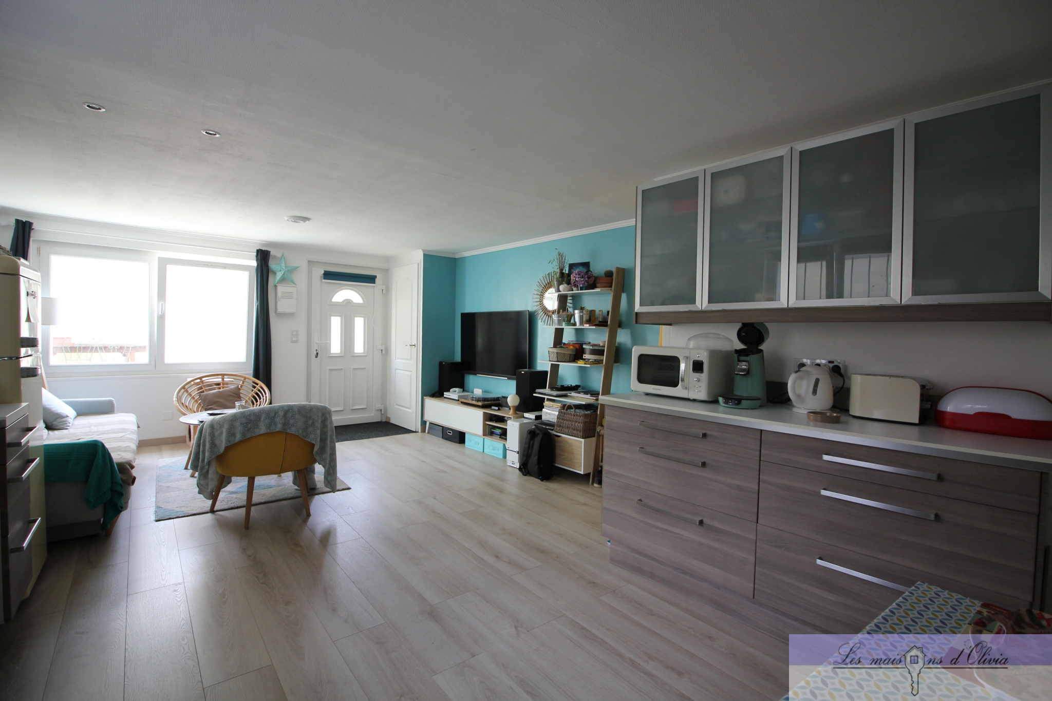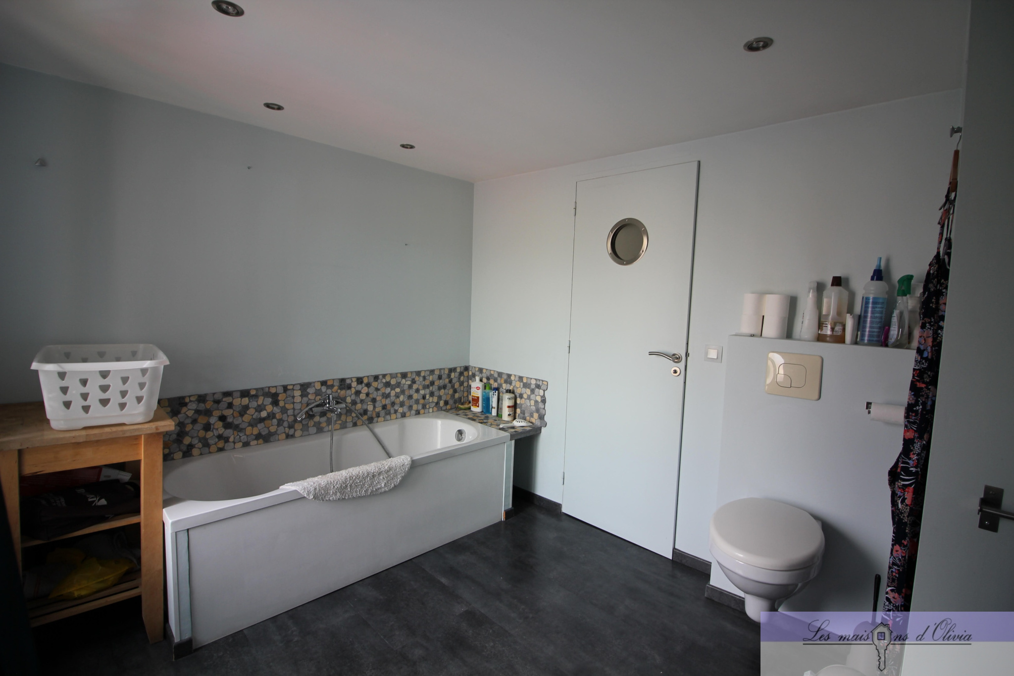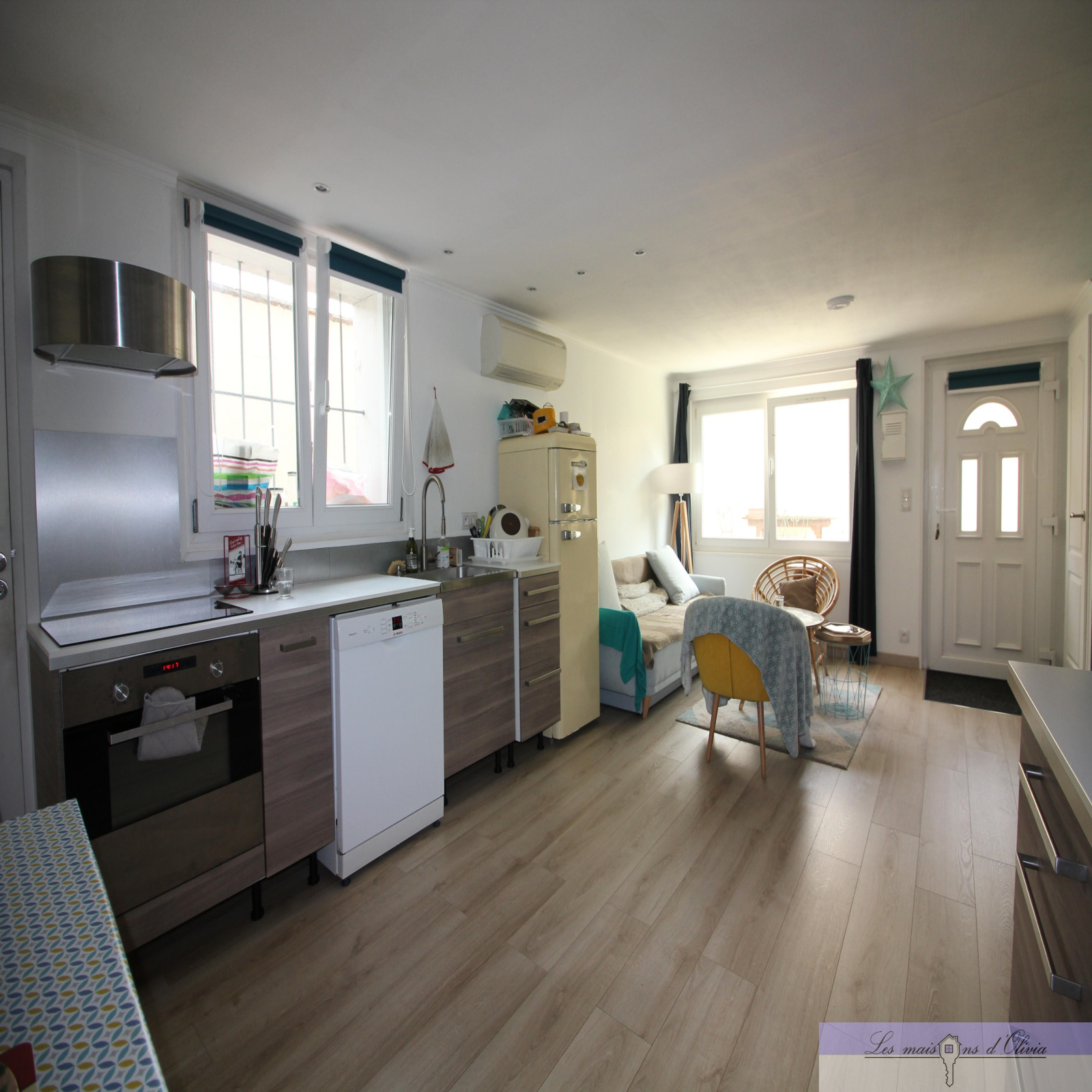 Elle comprend un séjour (env 28m²) avec cuisine ouverte aménagée donnant sur la partie terrasse/jardinet, wc , le 1er étage bénéficie d' une chambre d'environ 15m², une salle de bains qui offre, en plus de la baignoire, une douche à l'italienne et wc, combles aménagés en 1 chambre et 1 bureau avec velux.