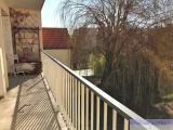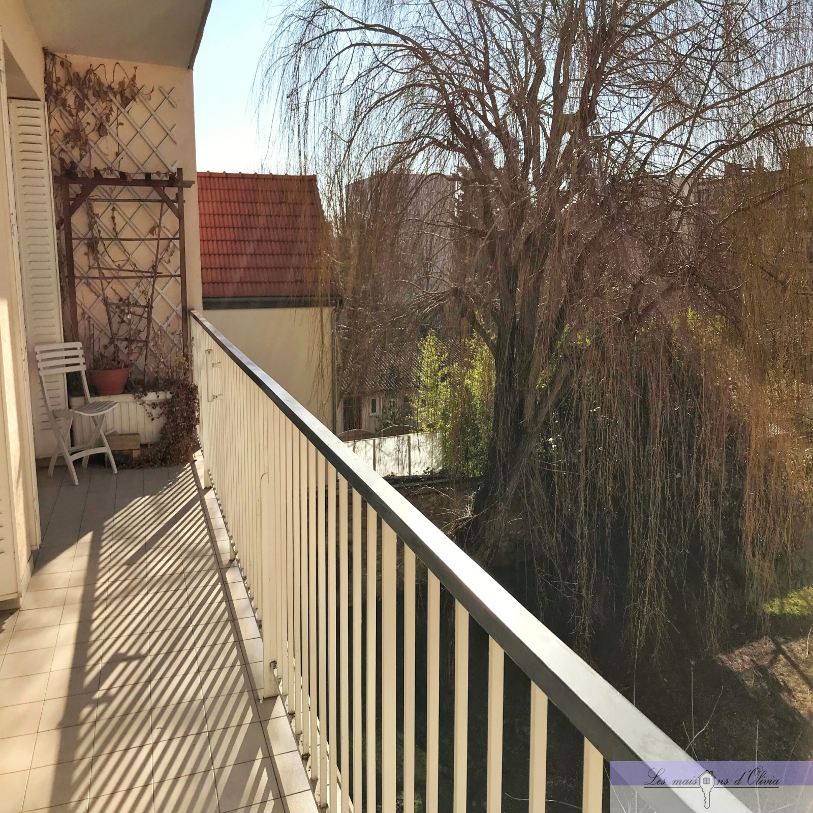 Le balcon, accessible par le séjour et par la chambre parentale donne sur un jardin arboré.